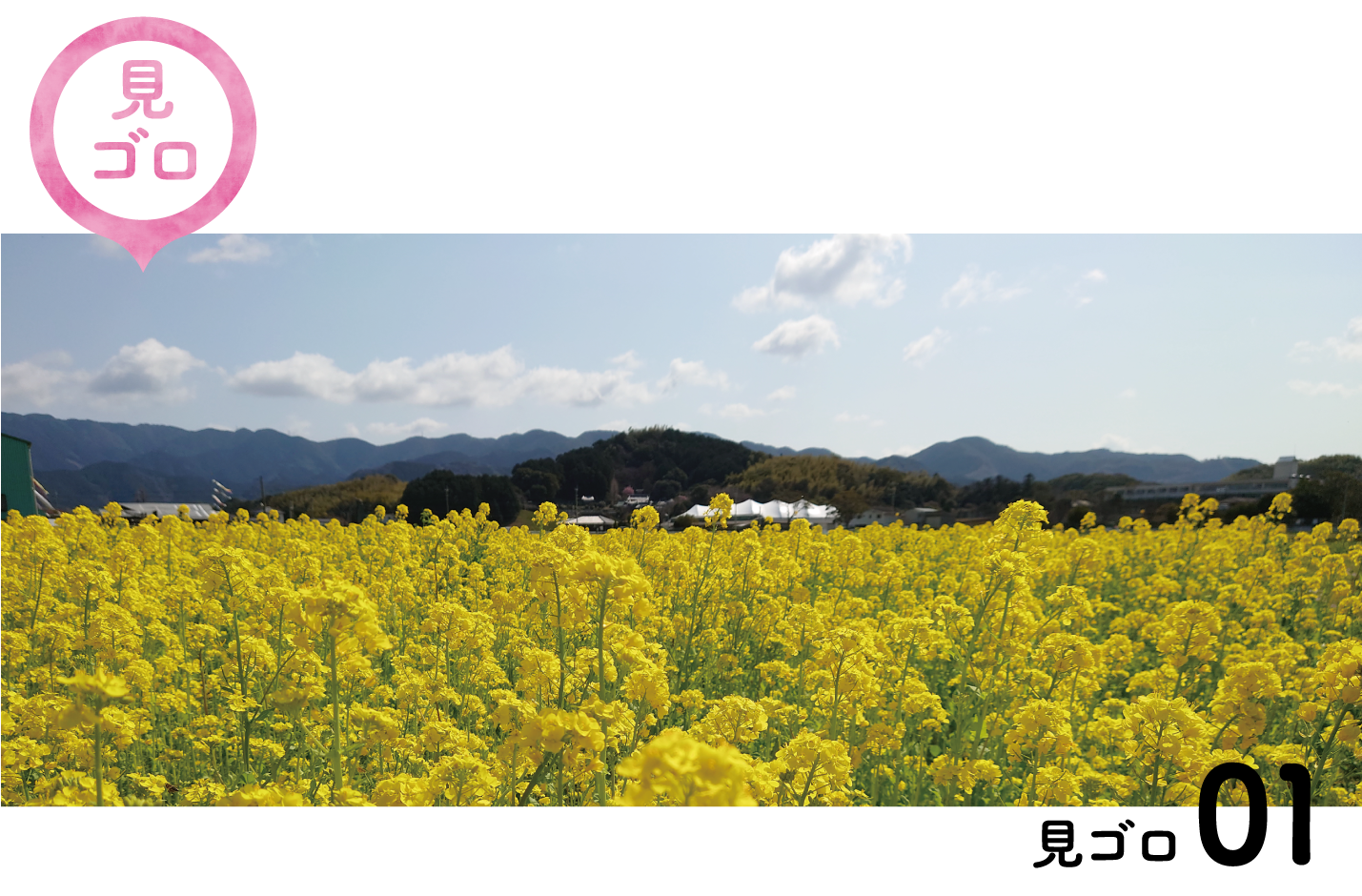 「なの花の道」の特徴は、県内有数の規模を誇る壮大な黄色いジュウタン。毎年3月中旬から4月上旬ごろ、6.0万平方mほどのエリアに約500万本とも言われる菜の花が咲きます。