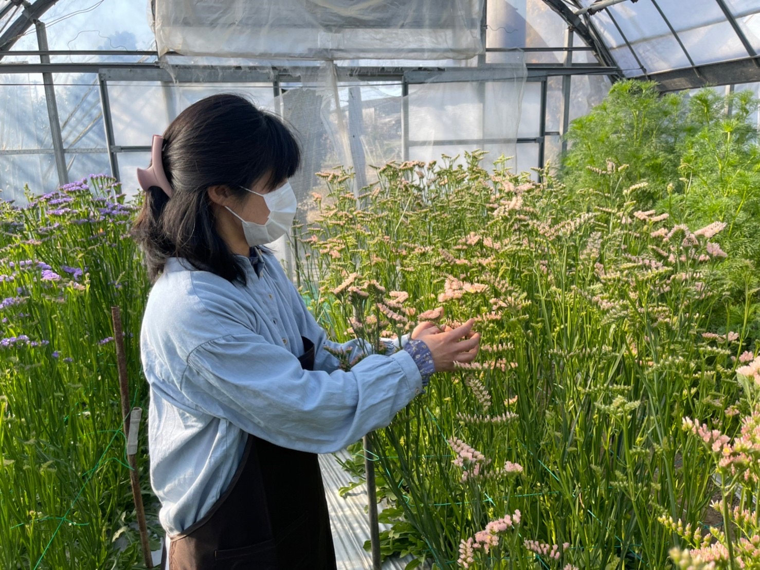 自身が育てた色とりどりの花を前に、安武祐子さんは生き生きと話をしてくれた。 カラー、パンパスグラス、ラナンキュラス、スターチス…。育てる花の品種はゆうに10種類を超える。